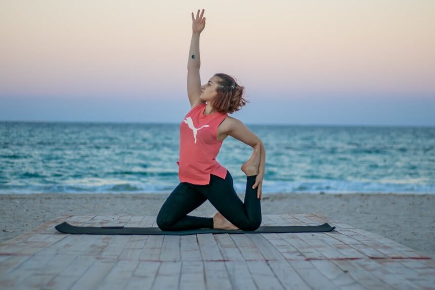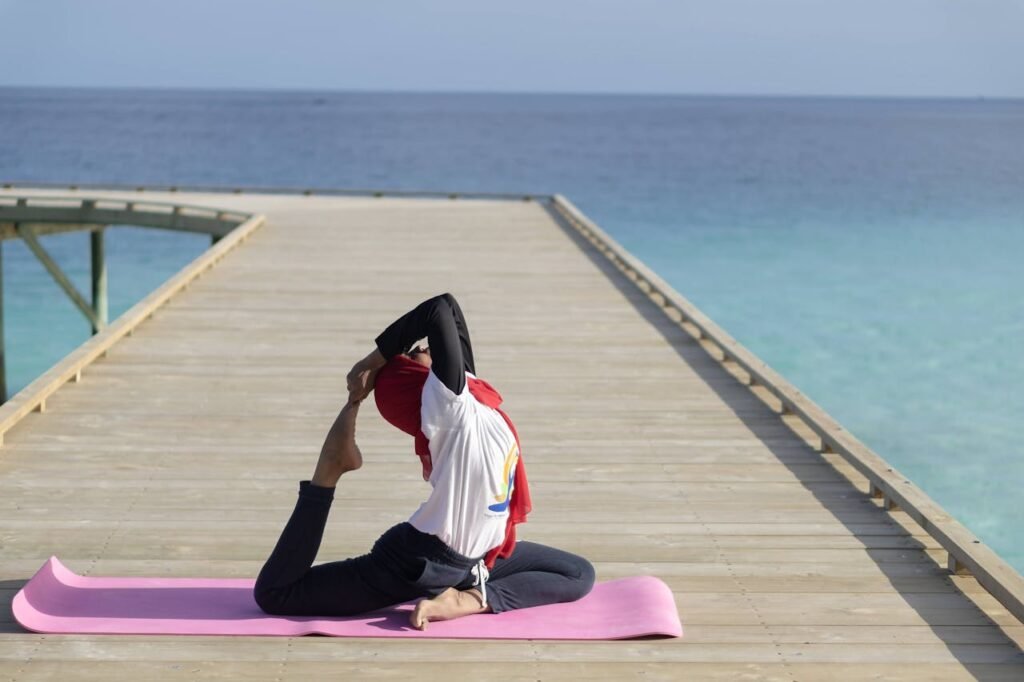 Morning beach yoga for a stiff back benefits from the combined action of gentle spinal mobility, core activation on an unstable substrate (sand), and the muscle-relaxing effects of warmth and humidity.