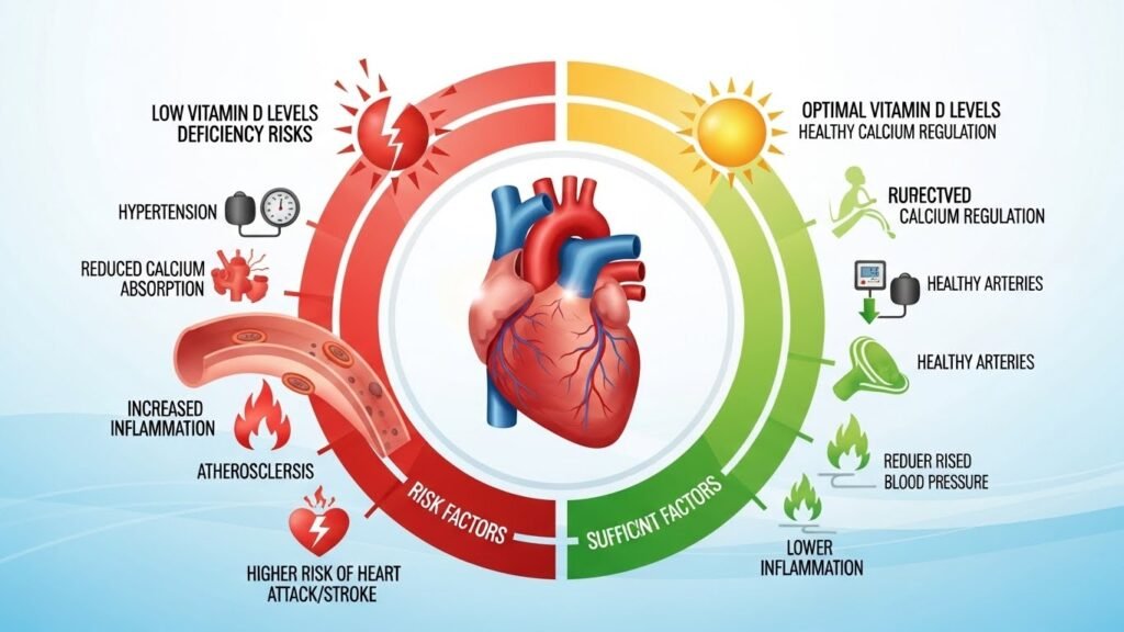 When levels drop, the protective mechanisms fail. The connection between vitamin d deficiency heart health risks is evident in observational studies showing that individuals with low levels of 25-hydroxyvitamin D have a significantly higher risk of heart attacks, heart failure, and stroke compared to those with sufficient levels.