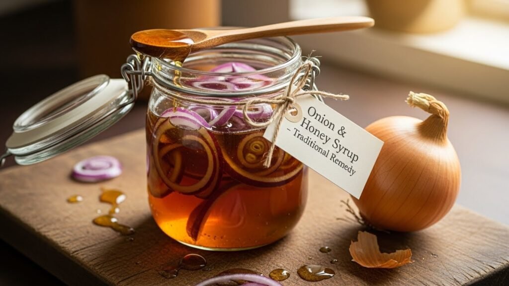 | Onion Honey Syrup | Quercetin, organosulfur compounds, honey enzymes | Mucolytic, antitussive, anti-inflammatory | Soothes cough, thins mucus, antimicrobial | Wet or dry coughs, sore throat, congestion |
