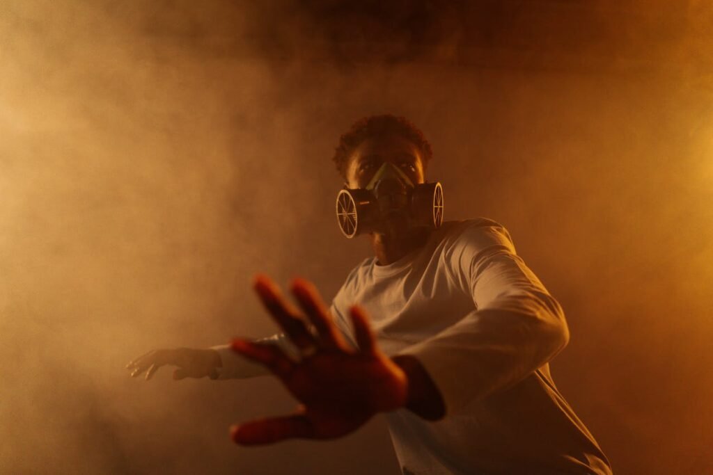 Photo by Ron Lach : https://www.pexels.com/photo/a-man-in-white-glasses-wearing-a-gas-mask-7959350/